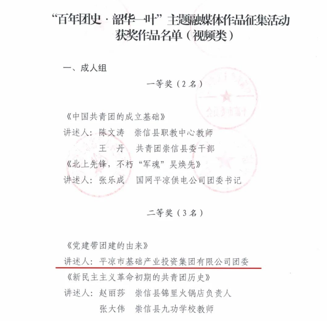 2022-04-28近日,在市委宣传部、市委网信办、市教育局、团市委、市文联、市广播电视台、市少工委联合开展的“百年团史·韶华一叶”主题融媒体作品征集活动中,市产投集团团委录制的“红色轻骑兵”讲团史《党建带团建的由来》微视频,喜获视频类二等奖。近年来,市产投集团团委在公