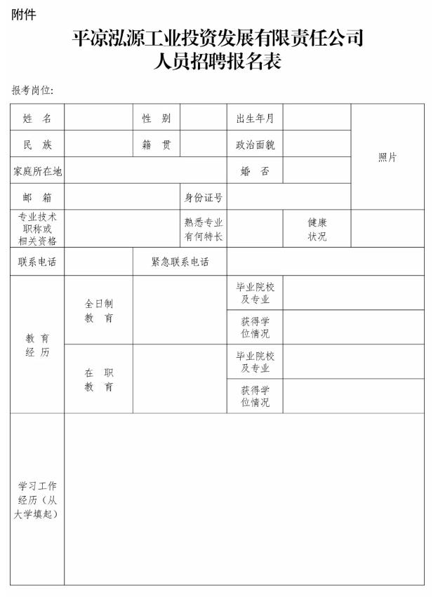 平凉泓源工业投资发展有限责任公司招聘公告